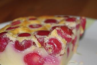 Placer les cerises au fond du plat et verser la préparation liquide.