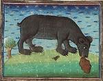 "Une ourse et son nouveau né, entouré par le placenta. L'ourse léchera son petit, et les hommes du Moyen Age pensaient qu'elle façonnait une masse informe, inachevée. D'où la célèbre formule "ours mal léché" pour qualifier un individu bourru et asocial. "