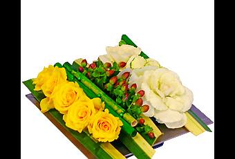 Un petit assemblage de roses blanches et jaunes dans un plateau décoratif.
