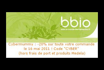 Le monde des bébés bio participe au Cybermummy de lundi 16 mai et proposera ce jour, une réduction de 20% sur tout le site avec le code CYBER (hors Medela).
