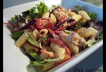 - Mélanger la mayonnaise (pour faire plus léger j'ai mis 3 cs de mayo et 2 de crème fraiche) avec le vinaigre, le parmesan et du piment dans un saladier. Ajouter les pennes, l'oignon, le poivron et le thon. Saler légèrement et mélanger.