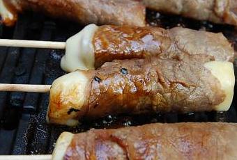 Découper le bloc d'emmental en 10 bâtonnets. Piquer chaque bâtonnet sur l'extrémité d'un pic. Enrouler chaque bâtonnet de 2 tranches de carpaccio.