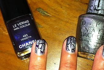 Une couche moyenne de Shatter sur le vernis et c’est super rigolo de voir l’argenté se craqueler…
