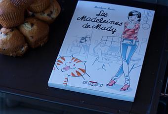 (par contre, je suis doublement désolée pour la photo : d'abord il ne s'agit pas de madeleines mais de muffins, je sais, mais pour tout dire je ne réussis pas très bien les madeleines. Et puis surtout, j'ai fait la photo, prise d'une inspiration soudaine, avant de lire l'album et de me rendre compte qu'il n'y était absolument pas question de gâteaux, la seule planche parlant de cuisine l'étant pour évoquer un désastre).