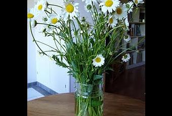 Pour faire écho au billet d'OXYGÈNE, j'ai cueilli un bouquet de marguerites.Des fleurs simples que l'on peut effeuiller si l'on a envie... mais, il y a un MAIS... elles dégagent une odeur assez insupportable. Une odeur un peu fumée, voire faisandée...Certain(e)s cuisinier(e)s les ajoutent en salade quand elles sont en boutons, et leur goût s'apparenterait à celui de la guimauve. On peut aussi préparer du vin de margueritesLes vaches en raffolent... des marguerites !!!Serait-ce pour cette raison qu'on les prénomme Marguerite ?Peut-être qu'à force de les ruminer, elles en deviennent "cinglées" !!!