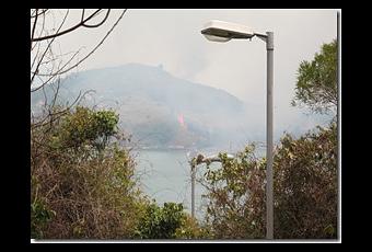 Un peu avant Lo Tik Wan, le sentier descend et cela sent étrangement le brulé… L’explication ne tarde pas à se faire évidente, face à nous: l’ile de Luk Chau est en feu!