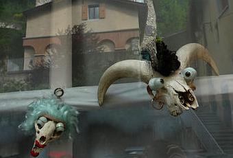 Plus fun qu'un simple rideau, voici la déco de fenêtre d'un particulier (un petit panneau précise bien qu'il n'a rien à vendre) de Pont-en-Royans. Sans doute réalisée par un crâneur !...