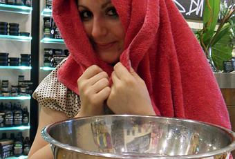 David, ma bonne fée de la journée, fait ensuite bouillir de l’eau pour le soin Tech’tonique. Il s’agit de petites pastilles effervescentes bourrées d’huiles essentielles. Dans l’eau bouillante, elles dégagent une buée à mi-chemin entre le sauna et l’inhalation. Je reste 5 minutes dans la fournaise, c’est difficile de respirer par le nez, mais je sais que c’est aussi bon pour mes poumons que pour mes joues rondes, alors j’inspire de grandes bouffées. C’est tout de même aussi bon quand ça s’arrête. pas besoin de me voir dans la glace pour savoir que je ressemble à une tomate rouge bien mûre. Le soin repose complètement et je crois que je me ferais bien une petite sieste. Ouais, au milieu de la boutique, même pas peur! Le truc génial avec les soins effervescents, c’est qu’on peut garder l’eau quelques jours au frigo et s’en servir comme tonique ou comme eau de rinçage.