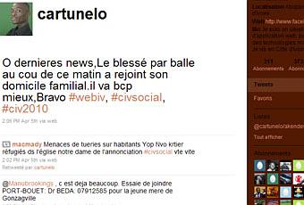 Ivoirien, Cartunelo utilise Twitter comme un relais sur la situation humanitaire dans le pays.capture d'écran de TwitterLes Ivoiriens utilisent l'outil de réseau social et de microblogging pour faire face à la crise qui touche le pays"SOS, Un asthmatique a urgemment besoin de Ventoline, marcory 03174202. Prête lui le tien, le temps kil trouve une pharma. #civsocial, #civ2010" : depuis le début de la semaine, denombreux messages comme celui-ci, posté jeudi 7 avril à 10h22 par Cartunelo, développeur africain d'application web, défilent sur Twitter.Face à la dégradation de la situation humanitaire en Côte d'Ivoire, les pro-Gbagbo et pro-Ouattara inscrits sur Twitter ont décidé de mettre de côté leurs divergences politiques et de s'entraider. Ainsi, ils publient des messages d'appel à l'aide avec le ashtag (symbole d'un fil de discussion sur Twitter) #civsocial.