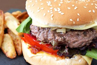 5. Enfin, assemblez votre hamburger : La partie inférieure du hamburger avec une tranche d’emmental et une tranche de tomate, quelques feuilles de salade, le steak haché, les oignons, du ketchup ou de la mayonnaise, les cornichons, et le chapeau du hamburger composé d’une nouvelle tranche d’emmental et de tomate. Pas la peine de vous préciser qu’avec des frites maison, c’est le top !^^