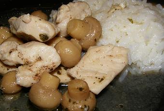 Pelez et hachez l'ail et l'oignon faites revenir avec l'huile d'olive , ajoutez les morceaux de poulet , les épices mélangez bien , arrosez de jus de citron sel poivre laissez revenir quelques instant . Ajoutez la cannelle et l'eau chaude , et les champignons de Paris, saupoudrez d'arôme plein sud couvrez et laissez cuire 30 minutes à feu doux.
