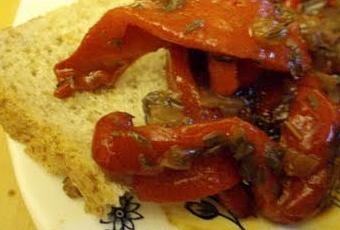 Épluchez et coupez en rondelles les oignons. Faites les revenir dans l'huile d'olive. Ajoutez les lanières de poivrons rouges et le thym. Faites suer quelques minutes et diminuez le feu, rajoutez un fond d'eau et laissez mijoter une quinzaine de minutes.