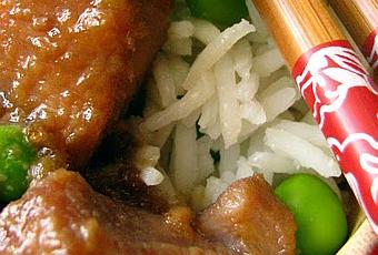Répartir le riz et les petits pois mélangés dans des bols. Ajouter les morceaux de sauté de porc puis parsemer de coriandre fraîche. Servir de suite.