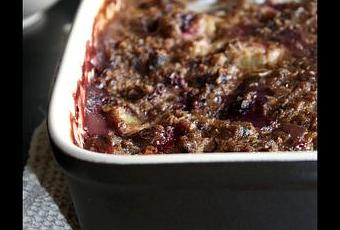 Faire bouillir le lait avec les graines de la gousse de vanille. Casser le pain en morceaux, et recouvrir avec le lait chaud. laisser ramollir. Ajouter le sucre, la cannelle et la farine de sarrasin. Mélanger avec les mains en écrasant les éventuels morceaux de pain. Ajouter la rhubarbe, les fruits rouges, les dés de chocolat, et la noix de coco, bien mélanger.