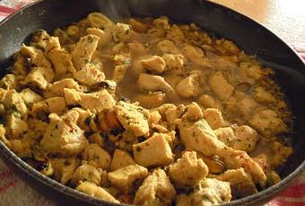 Après ce délai verser les cubes poulet et poursuivre la cuisson 8 minutes à petit frémissement sur feu moyen en remuant régulièrement pendant la cuisson.