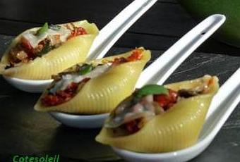 Je vous avais promis deux recettes livrées par le Chef du « Manoir des Brumes ». Après la charlotte aux légumes du soleil, je vous invite à mordre dans de grosses pâtes qui ressemblent d’ailleurs plus à des coquillages, et que les italiens appellent Conchiglioni. Vous entendez ça, cet accent ? Magnifique non ? (j’adore l’italien !!!).