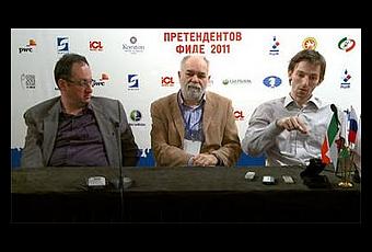 Ci-contre, les deux finalistes, Boris Gelfand et Alexander Grischuk lors de la conférence de presse mardi après leur qualification (interview menée par Boris Kutin au milieu) © ChessBase