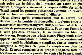 Au moment où les intégristes d’Ennahdha étalent au grand jour leurs projets déclarés de ralliements aux valeurs politiques à référence religieuses des partis de droite, et parfois même d’extrême droite, d’Amérique, d’Europe et d’Israël , je ne peux m’empêcher de rappeler à ceux, parmi nos jeunes qui ne comprennent pas ce que pourrait signifier, encore aujourd’hui , la revendication du mode de penser Bourguiba, que cela veut dire surtout : préservation de notre indépendance quoiqu’il en coute. Il m’est venu donc à l’esprit de procéder à l’évocation, que j’estime utile, de la position prise par la Tunisie face à l’invasion du Liban (1982) par les armées de Sharon et le siège de Beyrouth dans laquelle s’étaient retranchés Arafat et les résistants palestiniens armés.