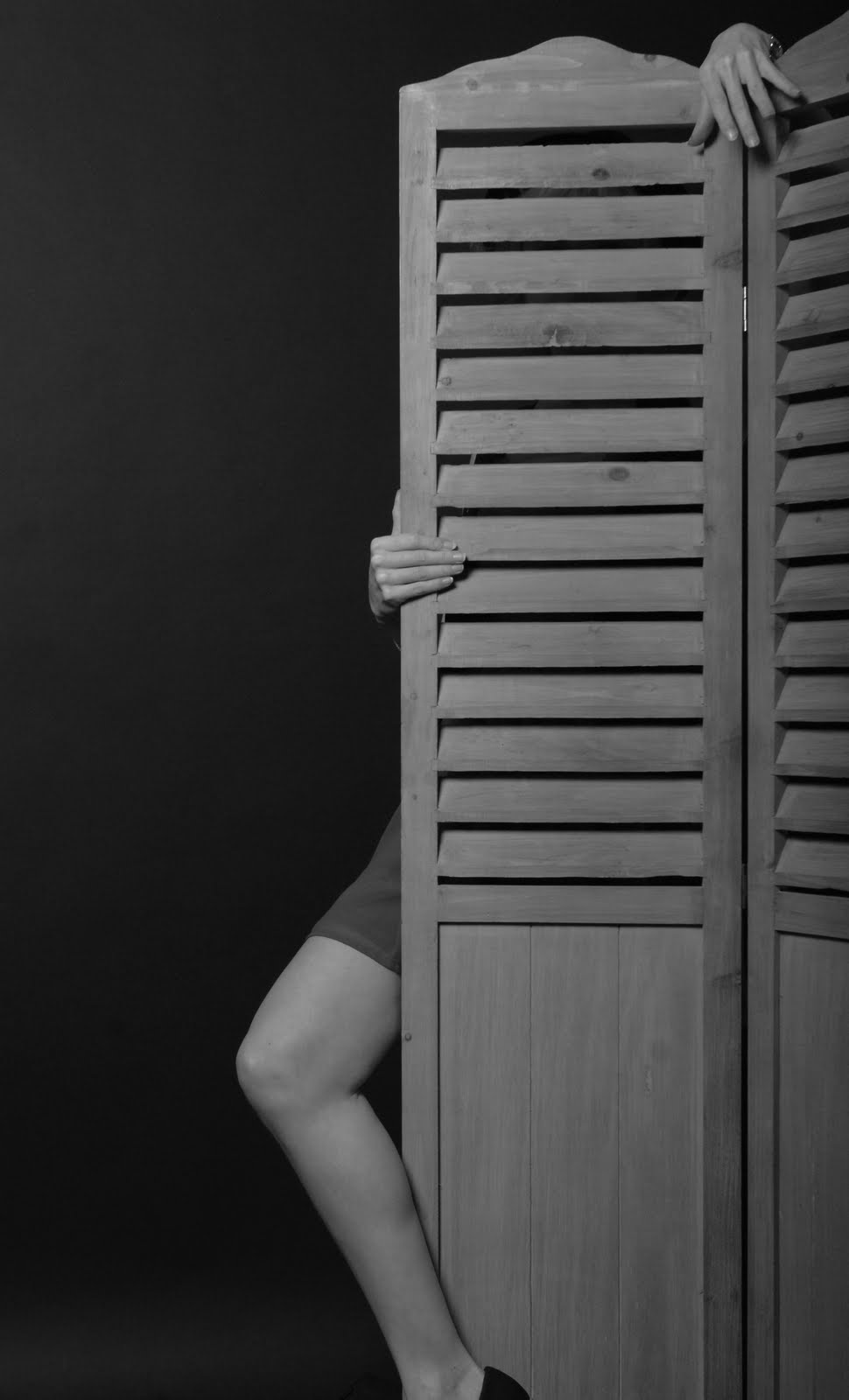 Voici une photo prise par Mélissa Cucci. Simple et très suggestive, la photo semble mystérieuse, gardant l'anonymat du modèle tout en offrant à la vue de tous des membres très expressifs: des mains fines et menues contrastant avec le pan de jambe offert en pâture à l'objectif. Un morceau de tissu et de chaussure nous révèle une non-nudité certaine mais que dire d'autre? Un déguisement peu commun que le paravent qui pose, lui aussi, en nous narguant avec cette question universelle: A quel point faut-il connaître quelqu'un pour le reconnaitre à partir d'une partie de ses membres?