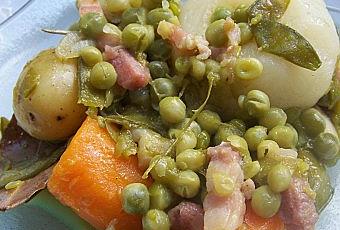 Dans une sauteus légèrement huilée, faire revenir l'oignon émincé grossièrement et les lardons, pendant 5 mn à feu vif. Rajouter tous les légumes. Réduire le feu. Verser un peu d'eau dans la sauteuse (environ 400 ml) et rajouter le bouillon. Laisser mijoter à couvert sur un feu doux pendant 45 mn. Assaisonner et mélanger de temps en temps. Rajouter 2 feuilles de laurier et un brin de romarin.