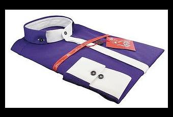 Les poignets sont carrés et ne sont pas envahit par une éruption de boutons. Pas de poche, tissu 100% coton armuré avec effet de rayures. Le pied de col, l'intérieur du col le poignet ainsi que la gorge cachée sont blanc en opposition. Une chemise très originale dans ce coloris pourpre.