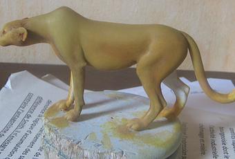 Pour me changer les idées, j’ai repris la peinture du guépard. Après quelques heures de plus à passer des dizaines de glacis de bruns et de jaunes, j’ai finit par trouver une teinte qui me satisfasse. La prochaine étape consistera à peindre les parties blanches de l’animal, de travailler l’expression du visage, de reprendre encore les volumes avant de s’occuper des tâches.