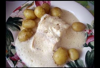 Napper les tronçons de lieu jaune avec le sabayon. Accompagner de petites grenailles cuites à la vapeur.