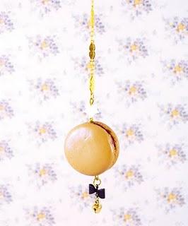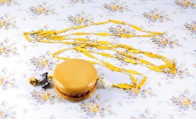Sautoir "Macaron caramel" composé d'un macaron en pâte fimo, d'une breloque noeud en laiton noir, d'une clochette (qui ne fait pas de bruit) en laiton doré, d'une étoile en nacre et d'une chaîne travaillée en laiton doré.Prix: 30 euros