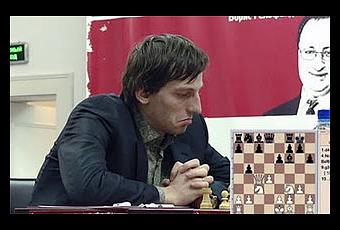 Ci-contre, l'arroseur arrosé dans la partie n°3. Avec les Blancs, Alexander Grischuk pensait surprendre Boris Gelfand en jouant une variante rare du Gambit Dame (9.g3). C'était sans compter sur la nouveauté théorique 9...b5! de l'Israélien. Résultat : nulle en 14 coups. © ChessBase
