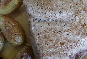 2) Dans une poêle: faire dorer le rôti sur toutes ses faces avec 1 cas d'huile. Le mettre dans le plat avec les pommes de terre et le poivrer généreusement. Déglacer la poêle avec 150 ml d'eau et verser dans le plat. Enfourner 25 minutes supplémentaires (pour une cuisson saignante)