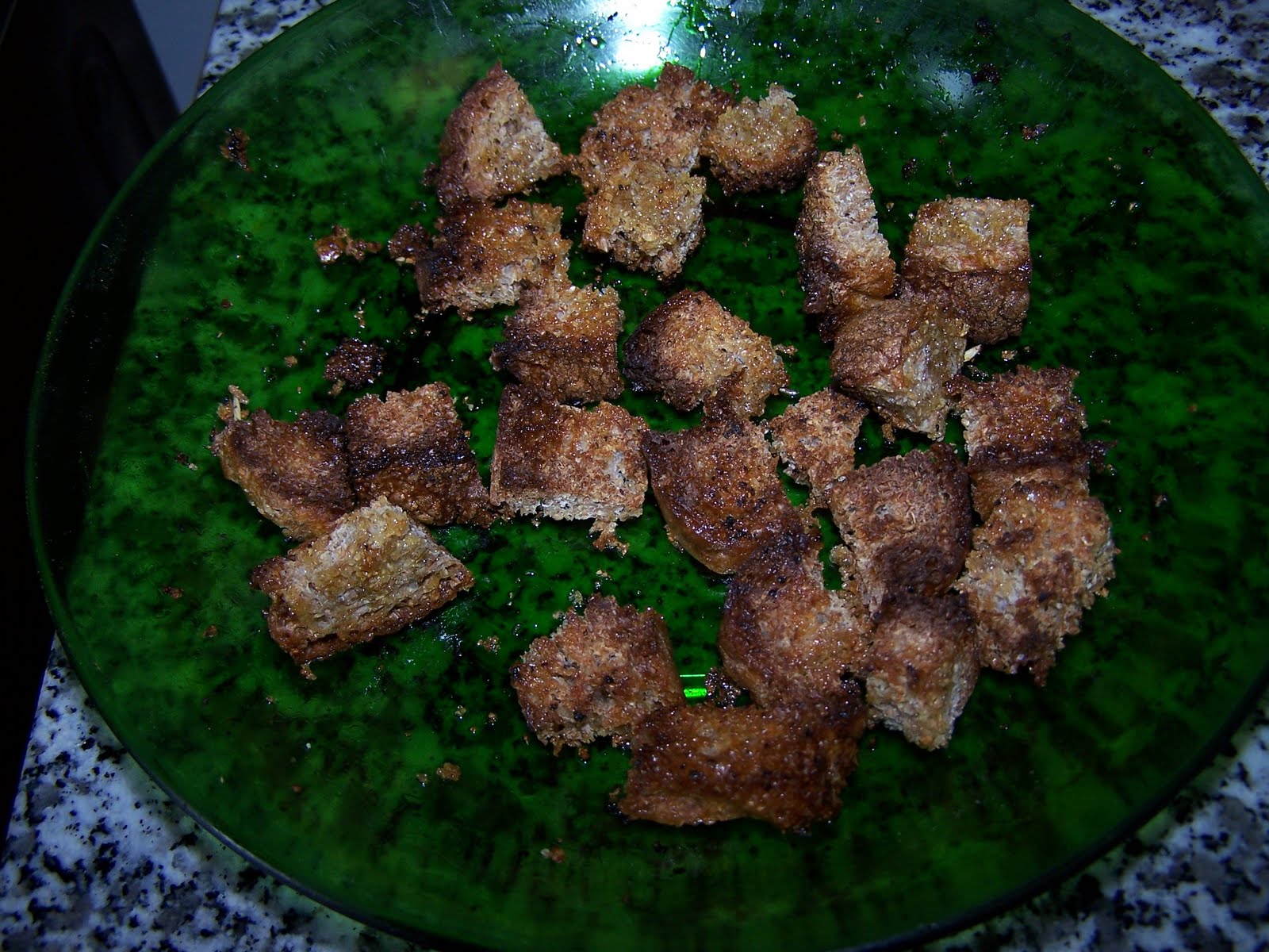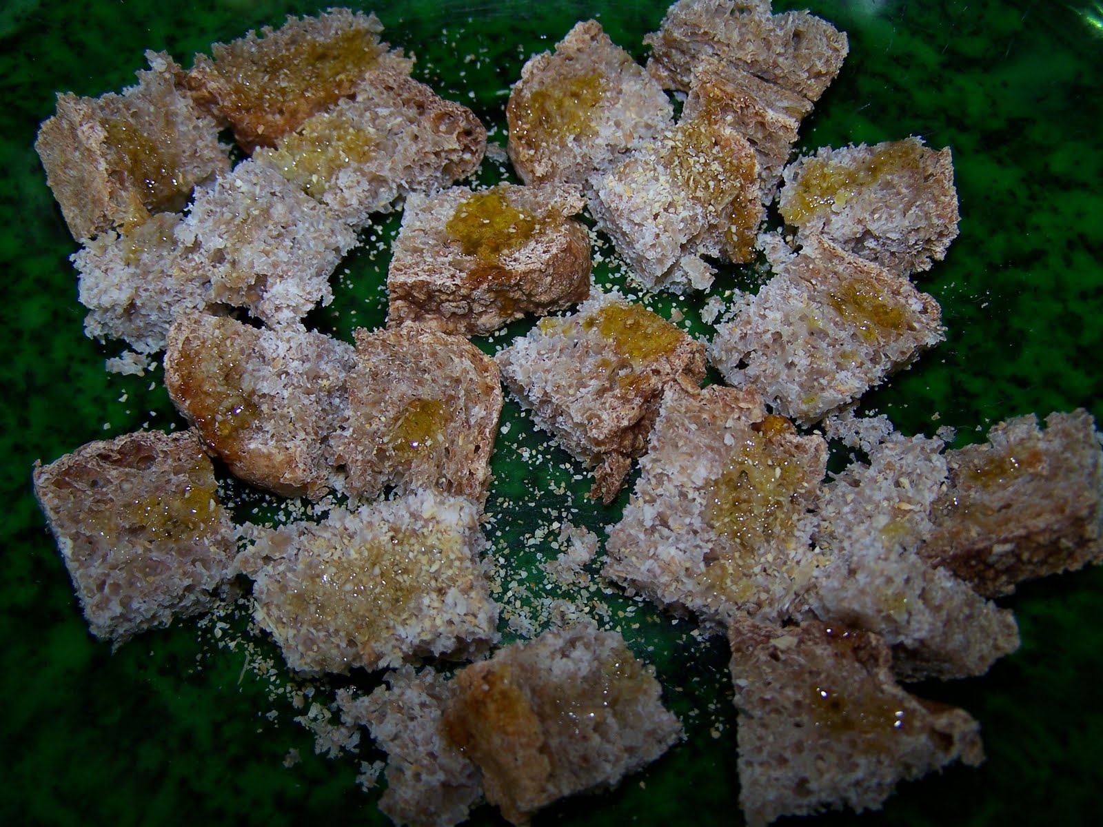 Voilà des croûtons "fait maison", avec du pain maison, peu gras et délicieux. Vous pouvez les utiliser pour accompagner une soupe ou une salade comme je l'ai fait pour ma salad'party.