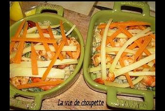 Ingrédients : 12 grosses crevettes - 125g de champignons de Paris - 1 petite courgette - 50g de comté - 50g de mimolette extra-vieille - 15g de beurre - 1 c à s de crème fraîche - 1,5 c à s d'huile - 1 petite c à c de paprika - sel et poivre