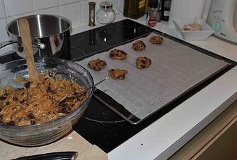 Ingrédient : 80 gr de beurre ramolli, 1 cuillère à café de cannelle en poudre, 125 gr de sucre roux, 1 oeuf, 150 gr de farine, 200 gr de chocolat noir en copeaux, 1 cuillère à soupe de lait.