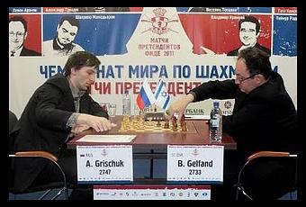 Ci-contre, une partie n°5 de haut-niveau! Après deux nulles insipides des parties 3 et 4, Grischuk et Gelfand nous ont enfin régalé avec un combat positionnel digne de leur rang © ChessBase