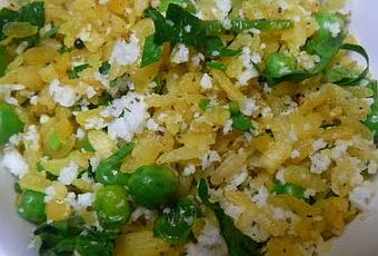 Le poha, ce sont des flocons de riz. C’est utilisé en Inde pour faire des plats pour le petit déjeuner, le goûter ou les desserts. Le riz est cuit à la vapeur, écrasé, puis séché pour faire des flocons. Les flocons de riz se trouvent dans des tailles différentes – gros, moyen et fin. L’inspiration pour cette recette m’est venue d’un livre de cuisine, en marathi (la langue de l’Etat de Maharastra d’où je viens), que j’ai acheté à Pune, la ville où habite mon frère cadet et où j’ai passé une semaine. Petite parenthèse, j’ai épaté mes parents, qui pensaient que j’avais oublié cette langue et que je n’arriverai pas à lire ou suivre une recette dans cette langue !!! Le plat salé avec les flocons de riz, le plus couramment servi, est pratiquement la même recette, mais sans les petits pois (kande pohe – flocon de riz aux oignons) ou avec des pommes de terre au lieu de petits pois (batata pohe - flocons de riz aux pommes de terre).Flocons de riz aux petits pois Ingrédients 1 tasse (250 ml) de poha (flocons de riz) moyen1 càs de ghee1 oignon1 càs de graines de moutarde1 càc de graines de cumin½ càc de curcuma1 tasse (250 ml) de petits pois (cuits à la vapeur ou dégelés s’ils sont congelés)Sel et poivre du moulin4 càs de noix de coco, râpée (fraîche ou séchée)4 càs de feuilles de coriandreJus d’un ½ citron1 piment vert, émincé (facultatif)Méthode :Si les flocons de riz sont moyens les passer sous l’eau dans une passoire, s’ils sont fins, les laisser tel quel.Faire chauffer le ghee.Y faire éclater les graines de moutarde et de cumin.Ajouter le curcuma et l’oignon et le faire dorer.Incorporer les petits pois, le piment vert, si utilisé, le sel et le poivre.Couvrir et laisser cuire 3 à 4 minutes.Ajouter les flocons mouillés et bien remuer pendant 1 minute.Ajouter la coriandre, la noix de coco et le jus de citron.Mélanger et servir chaud.