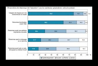 En pratique, les habitudes de prescription par les MG du dépistage du VHC varient en fonction des groupes de personnes à risque. Le dépistage estfréquemment proposé aux utilisateurs de drogues par voie intraveineuse (Udiv) et aux personnes transfusées avant 1992, moins souvent proposé aux personnes ayant subi un acte chirurgical invasif, aux personnes tatouées ou ayant un piercing, même si chez ces dernières une augmentation significative de la proposition de dépistage est observée depuis 10 ans. Ainsi, plus des trois-quarts des médecins (76,6%) déclarent proposer le dépistage du VHC de manière systématique aux usagers de drogues et près d'un sur six (16,1%) déclare le faire souvent.