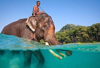 Duo. Cet homme nage dans le bonheur. Les îles Andaman, dans l’archipel situé dans le Golfe du Bengale, est le seul endroit au monde où l'on peut voir des éléphants traverser la