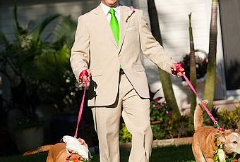 Un mariage original : le marié promène ses ciens dans son jardin. Chaque chien porte un collier de fleurs et reste coordonné au theme du mariage.