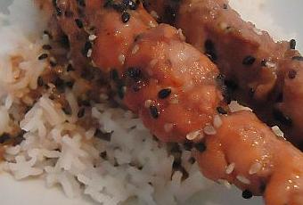 -Parsemer les brochettes des graines de sésames et les faire griller en les nappant de sauce.
