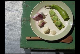 Crue, le vert pâle de son enveloppe n'appète pas vraiment, alors que cuite, son beau vert tendre nous fait de l'oeil. La fève fraîche est là, accompagnée des somptueux petits pois, rivière d'émeraudes dans leur cosse bien renflée qui garantit le meilleur de la saison. Pour réveiller leur suavité toute printanière, un peu candide et irrésistiblement pimpante, l'ail nouveau fait merveille.
