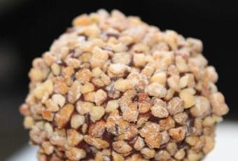 Faire fondre le chocolat noir au bain-marie, tremper chaque pic dans un peu de chocolat avant de piquer chaque boulette. Plonger les boulettes dans le chocolat fondu avant de les recouvrir de grains de pralin.