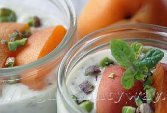 Les pistaches sont cassées en petits morceaux et l’abricot coupé en tranches. Ces touches de vert et de orange sont ajoutées sur le dessus du yaourt.