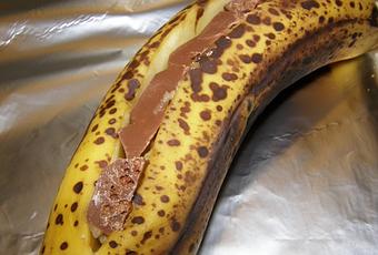 Il faut entailler la banane sur un flan avec sa peau écarter légèrement et y glisser du chocolat en morceaux tout le long de l'entaille emballer dans du papier aluminuim pour fermer en papillotte et mettre au four chaud à 200° pour 15 minutes !!