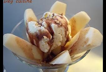 - Dans des coupes, disposer les lamelles de poire en "fleur" sur les bords, déposer au centre une belle boule de glace vanille et arroser le tout de sauce au chocolat.