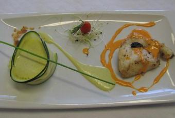 Cœur de cabillaud poęlé sauce poivrons rouges et son flan d’aubergines sauce poivrons verts