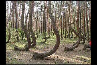 Gryfino certainement la ville la plus ancienne de Pologne, à quatre kilomètres au sud de la ville se trouve une étrange forêt de pins. On y trouve environ 400 arbres ayant une forme très particulière. L’age des arbres est entre 60 et 80 ans, et on ne connait pas la raison exacte de cette extravagance de la nature. Peut-être y’a-t-il eut une intervention humaine à l’origine pour obtenir cette courbure du tronc.