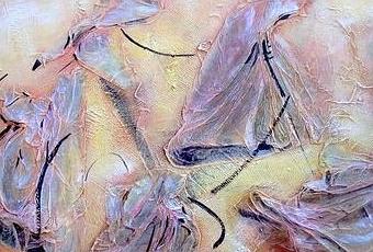 Plusieurs couches de peinture entreposées et travaillées chacune Ensuite es tposé du papier-serviette pour faire les silhouettes et à nouveau plusieurs couches.