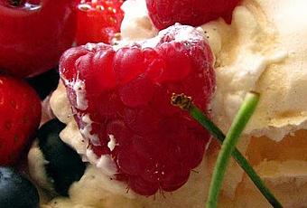 Déposer la crème chantilly sur la meringue refroidie. Répartir les fruits sur le dessus et décorer avec quelques cerises. Servir de suite.