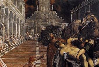 "... Deux marchants vénitiens, Rustico et Buono, en 828, ramènent en barque les restes de Marc cachés dans de la viande de porc pour échapper aux contrôles musulmans. Le corps d'un saint chrétien relié pur porc afin de ne pas être touché ou détruit par des intégristes islamistes, voilà du grand humour catholique. (...) Tintoret lui a carrément fait entrer un chameau sur la place au milieu d'éclairs semant la panique (ce tableau ahurissant est à l'Accademia."