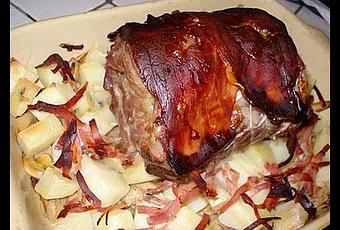 Cuire 1h15 à 210°C.Servir tranché avec la garniture et des haricots verts.